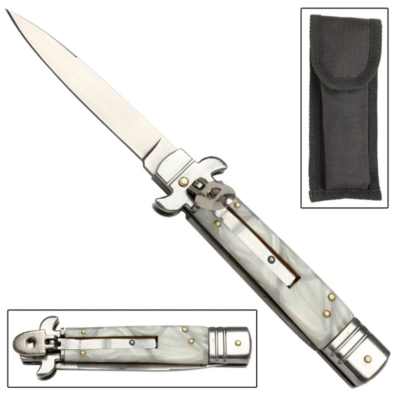Providing the perfect synthesis of a stiletto and a lever lock, this uniquely styled awesome push lever features excellent workmanship and reliable action. The flat ground stainless blade features a high polish finish, when you press the lever release the action is fast and the lock-up is solid. These knives make beautiful collector pieces and are sure to be a treasured part of any collection. Overall Length: 7.75 Inches Blade Length: 3.25 Inches Blade Material: Stainless Steel with Silver Finish Handle Length: 4.5 Inches Handle Material: ABS with Marble Finish and Brass Rivets Includes: Free Nylon Case with Belt Loop