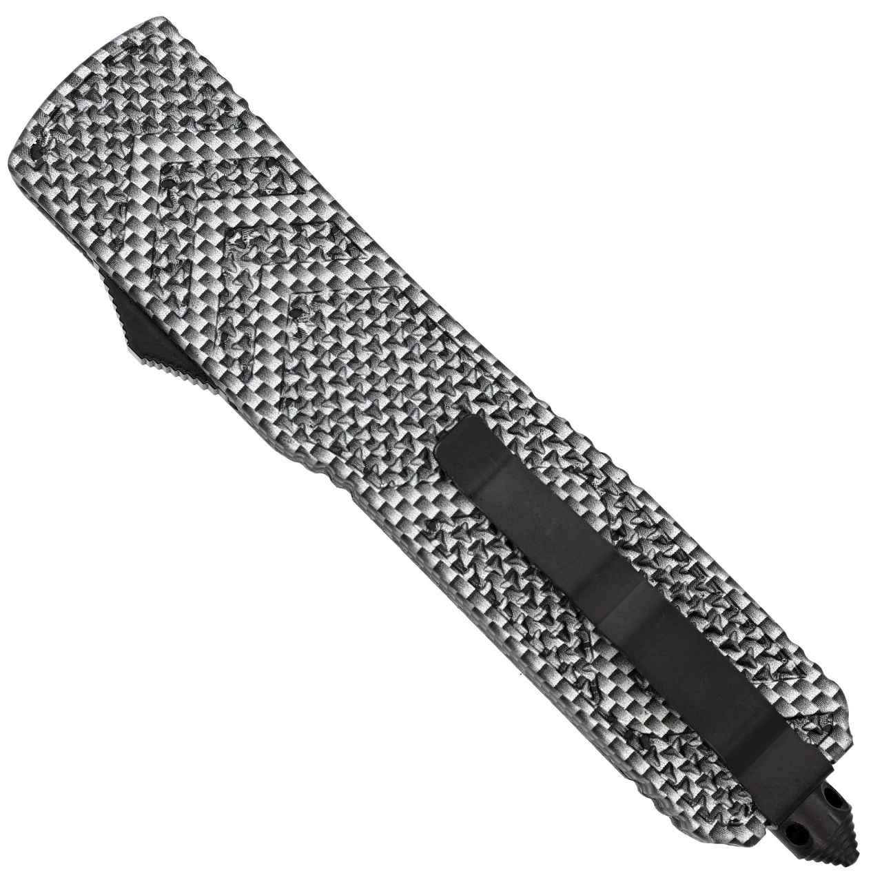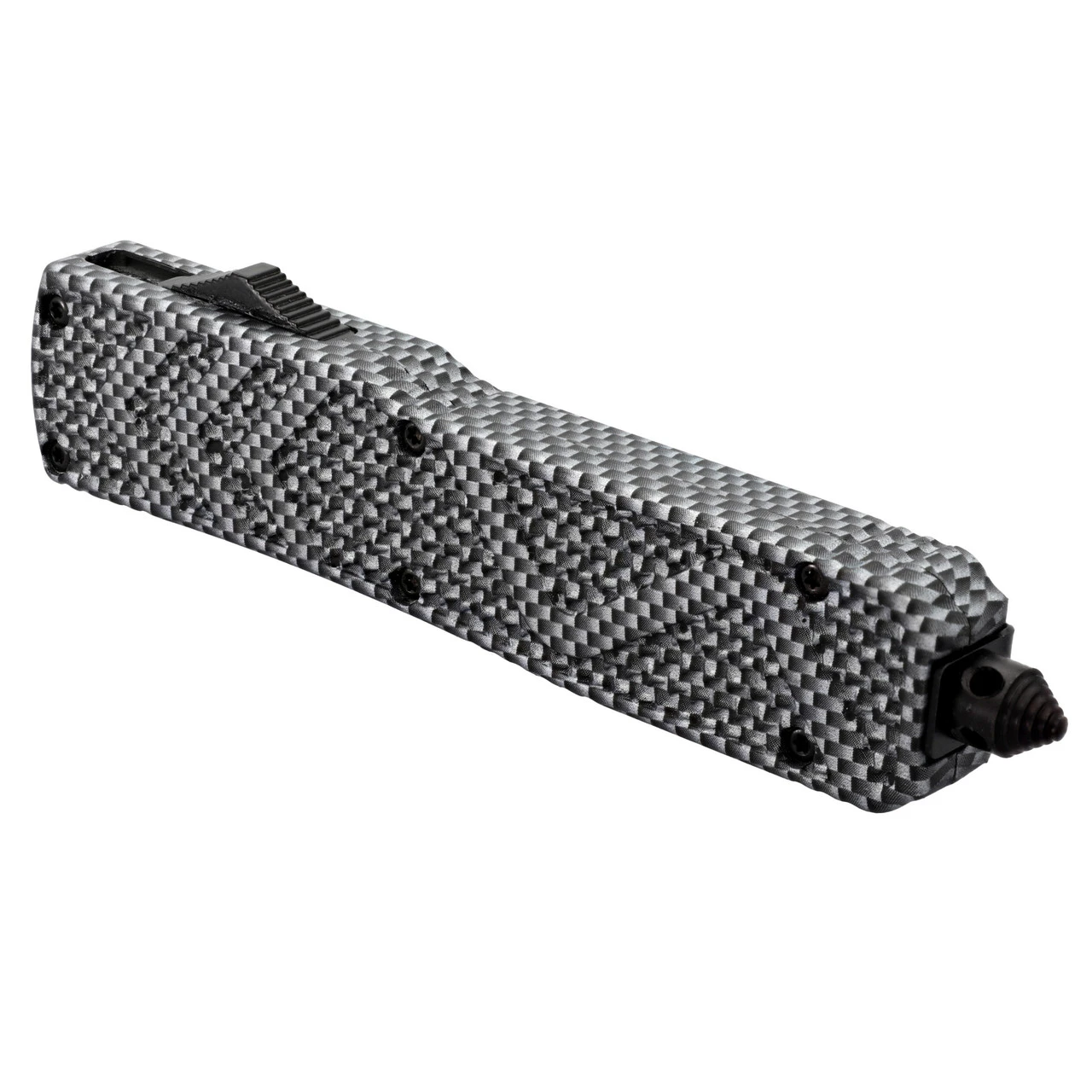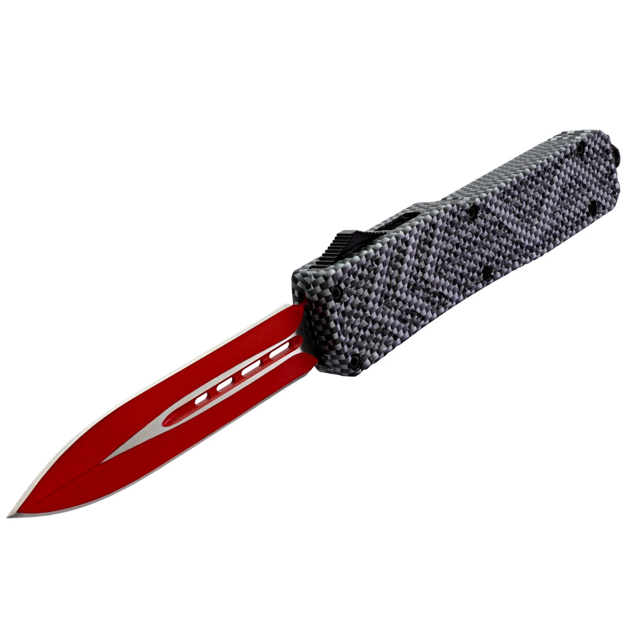 The Red on Steel OTF is an industrial vision. The handle has multiple shades of gray with an ombre checkered finish. Raised texturing on both sides of the handle provide non-slip features while adding to the design and feel of the knife in your hand. The blade is a bold, stunning red with silver highlights. Four cutouts adorn the center of the blade to balance and distribute weight for more precise handling. The switch to deploy the blade is located on the side of the handle and is textured itself for easier use. Included with the Red on Steel OTF is a nylon sheath equipped with a belt loop for safe storage and easy carry. Overall Length: 9.5 Inches. Weight: 0.8 lbs.