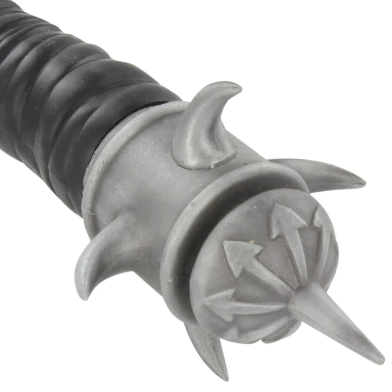 The Ritual Possession Divine Chaos Fantasy Axe has a blade that is constructed of stainless steel with etching on the blade. The blade has a wicked jagged edge adding to this menacing looking piece. The zinc aluminum handle is adorned with several wicked spikes with a painted faux wrapped handle. A skull is featured at the top near the blade with a spike out the top and a pick axe. Included is a stand to display this unique piece. Overall length is 15.75 inches.