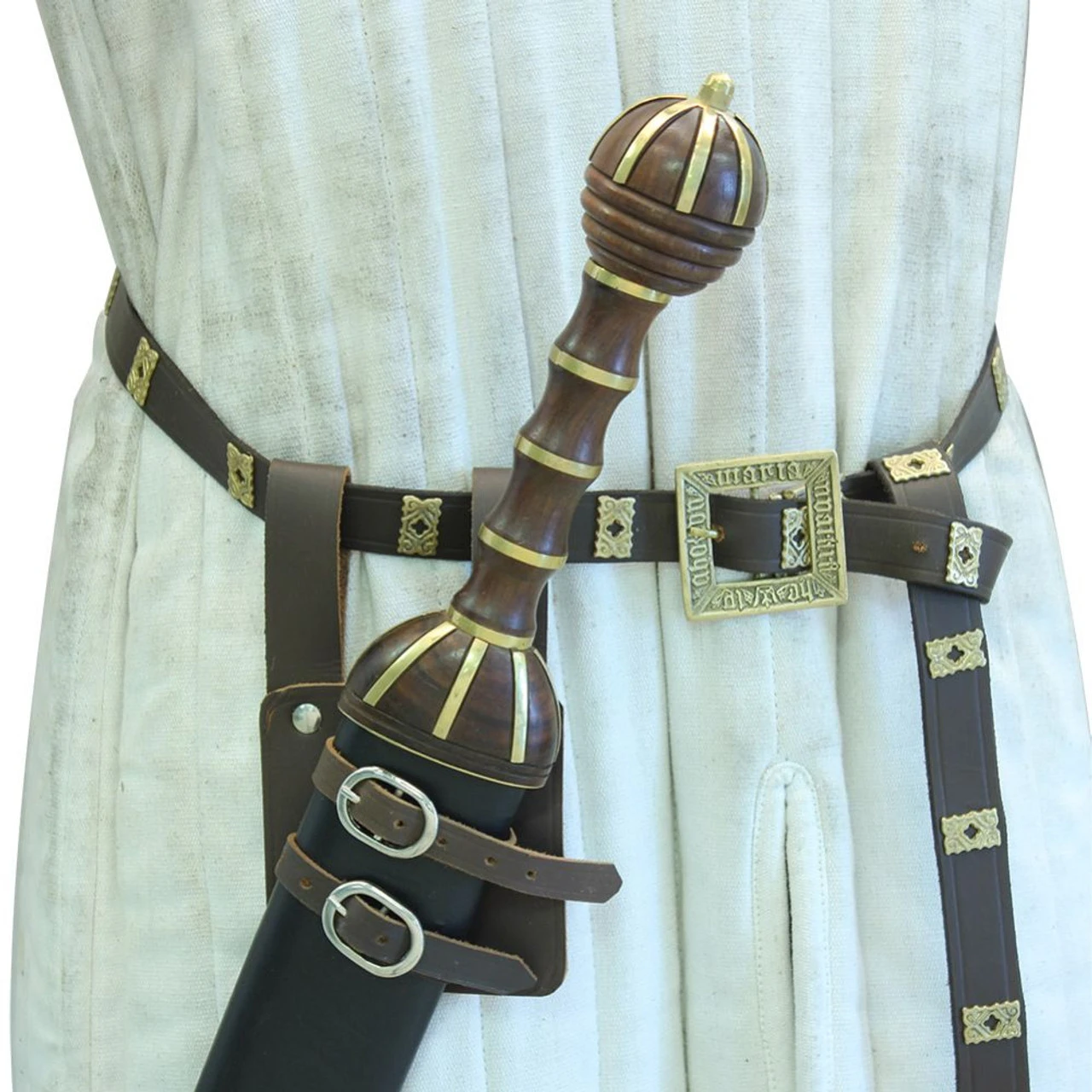 The Roman Foot Solider Sword is constructed of carbon steel and the handle is full hardwood with brass accents. Included is a wooden scabbard that is wrapped in black leather and hand-sewn. Overall length is 32 inches.