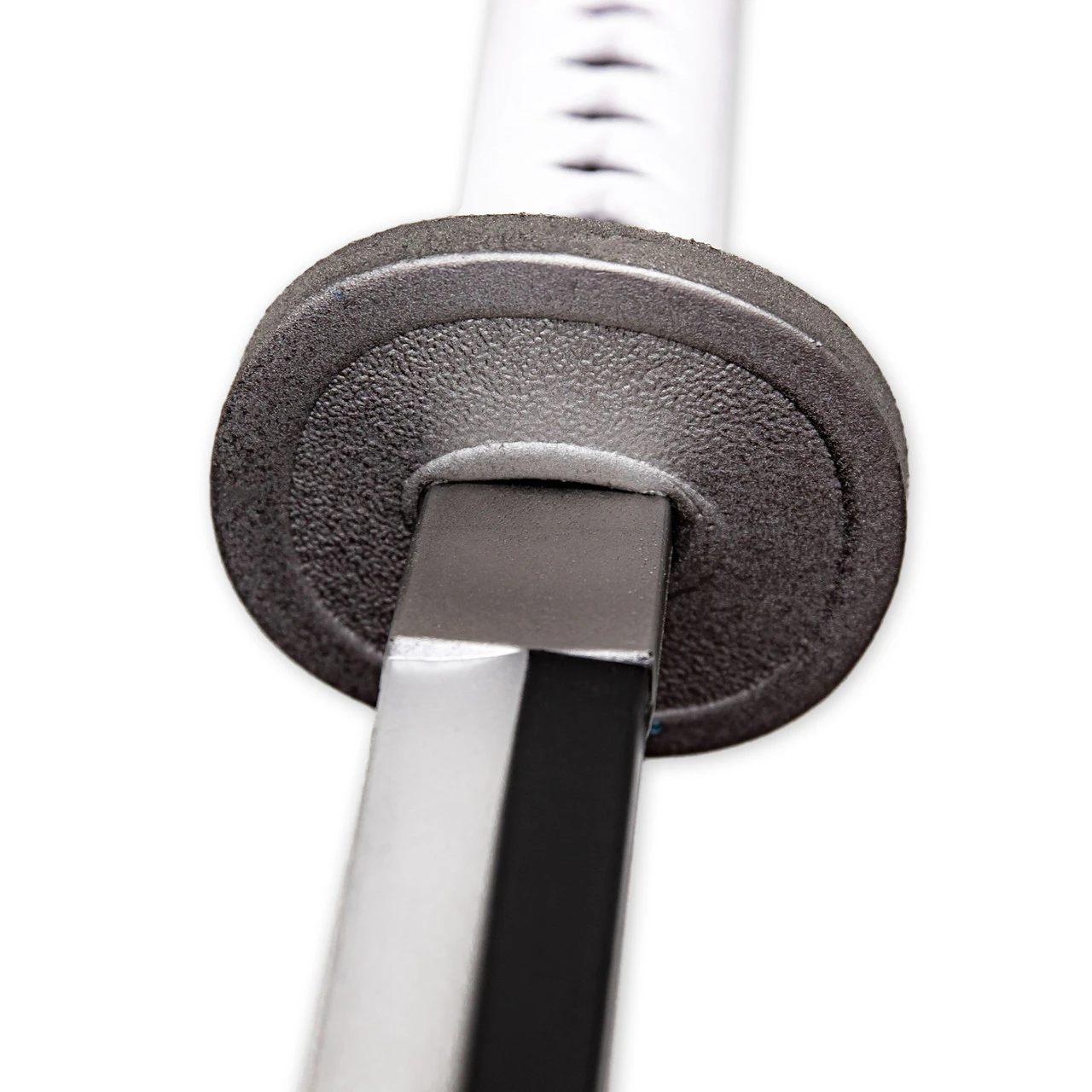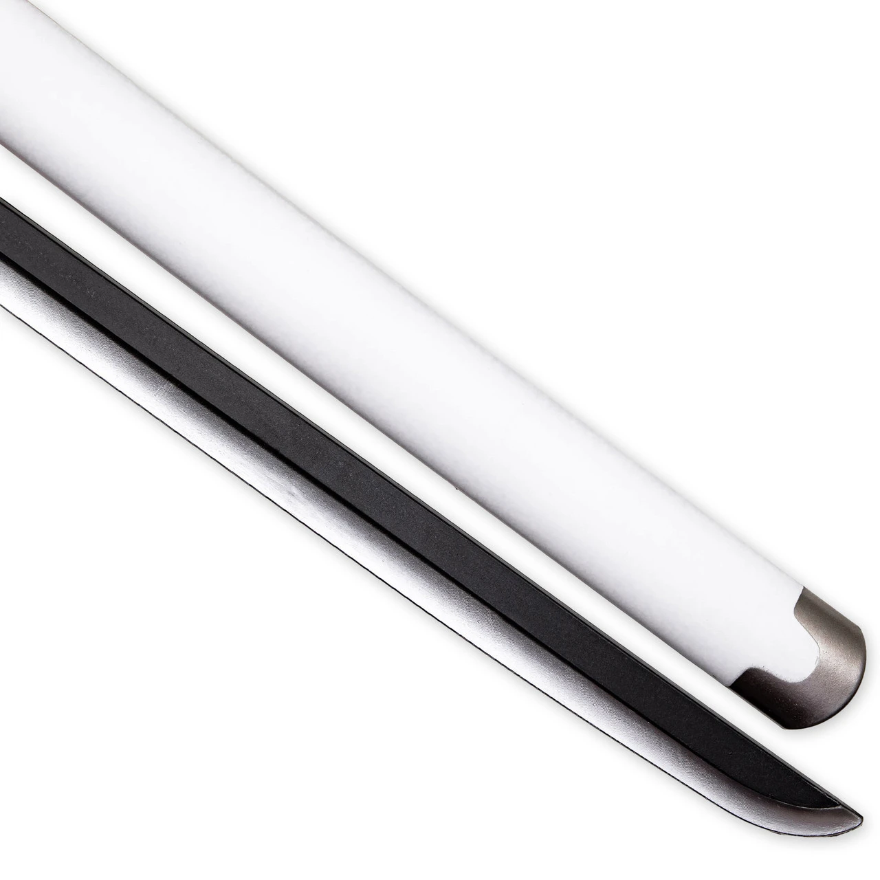 This replica may be made of foam, but it is certainly no children’s toy. This Wado Ichimonji katana sword is composed of polyurethane foam and features a 10 mm fiberglass core. Polyurethane foam is both durable and flexible, and the added fiberglass core creates a strong sword that can be used for cosplay as well as kicking bad guy butt in mock battle. The handle is molded to resemble a traditional Japanese wrapping in white cloth, and an underlayer of black ray skin. The circular silver foam hand guard (or Tsuba) comes detached and assembly is extremely simple. A mock habaki separates the blade from the handle. A fully white scabbard composed of hard plastic is included with this sword so you can safely carry your new prop around your next convention.