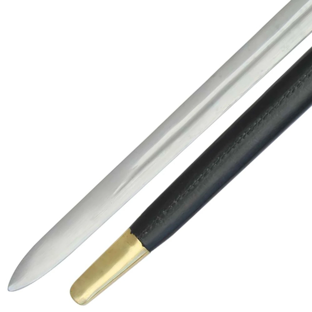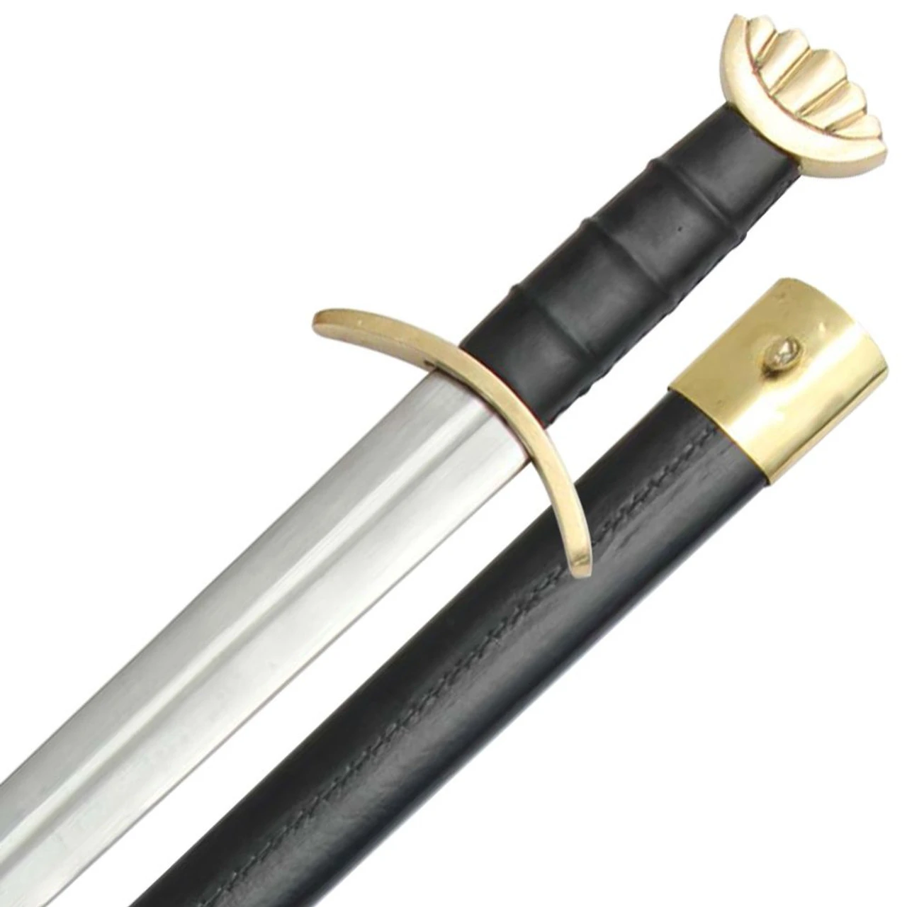 The Savage Brass Viking Sword is constructed of steel with a scalloped brass pommel as seen in the Viking Age. The grip is hand stitched leather leading down to a brass cross guard. The wooden scabbard is covered with hand stitched leather with brass locket and chape. The locket on the scabbard sports a frog stud that is a button or flange attached to a scabbard body, used to secure the scabbard to a frog.