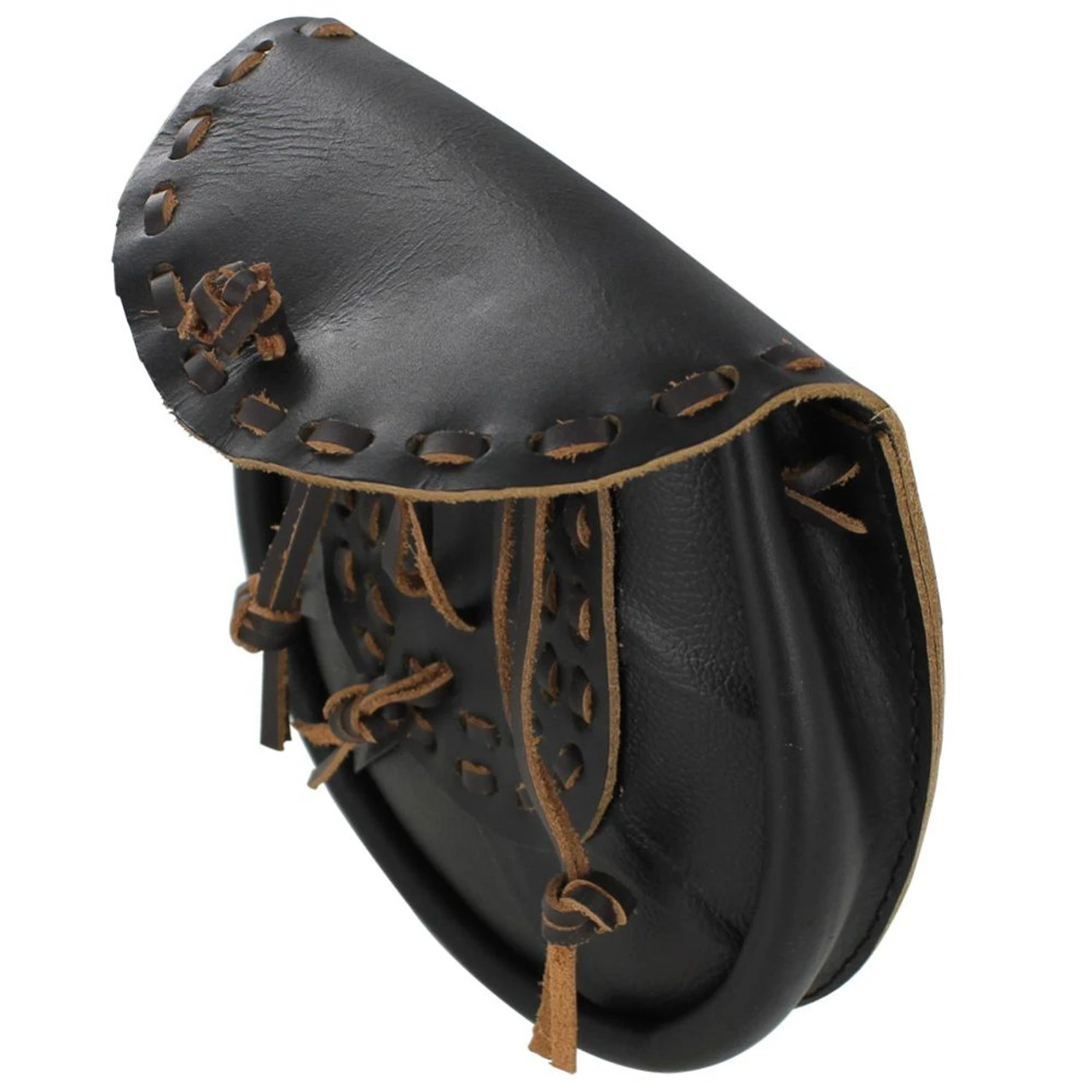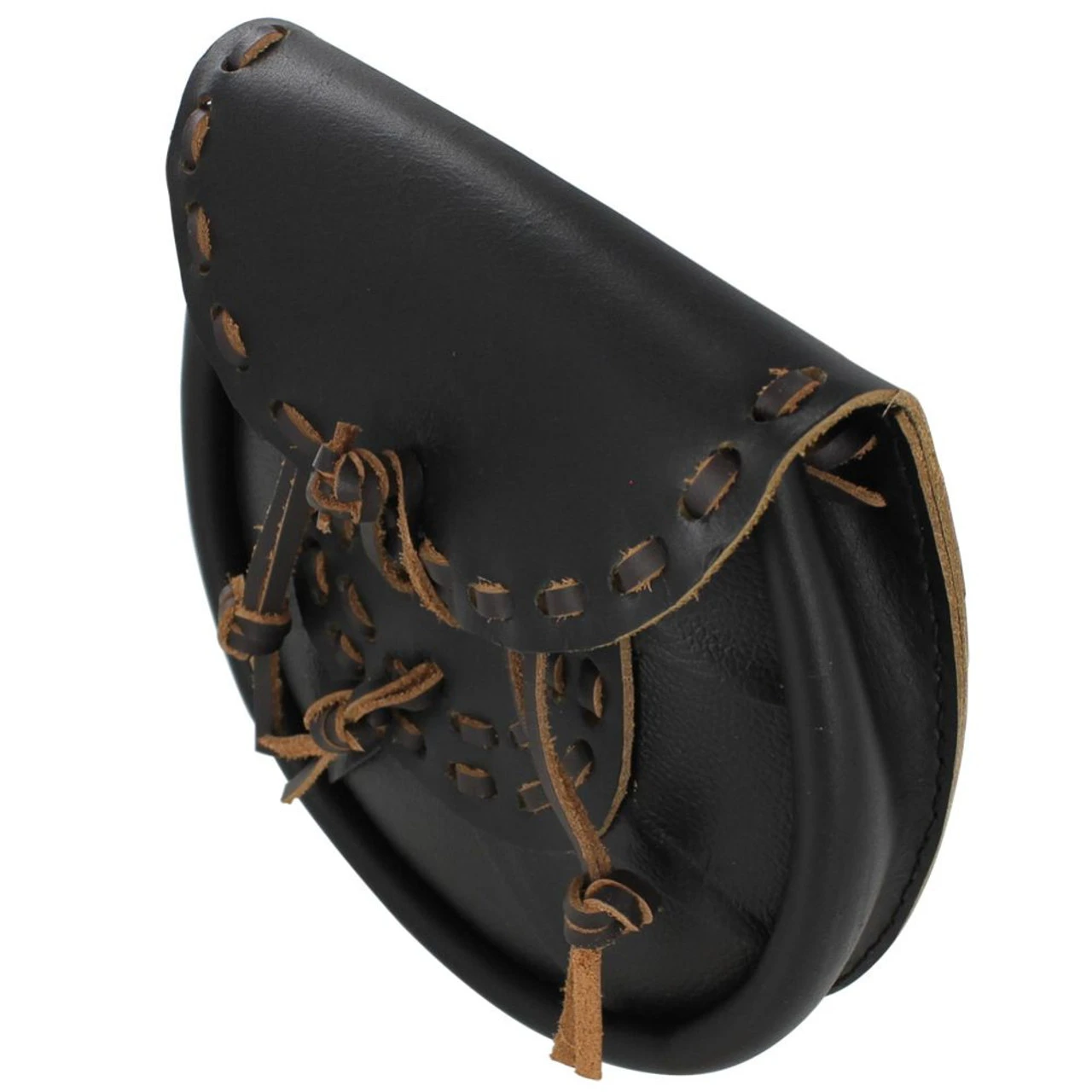 The Scottish Leather Sporran Pouch is constructed entirely out of 100% genuine leather, hand-stitched, with tied tassel. Three leather tassels with knotted ends hang for decoration. Belt Loop Size: 2.75 Inches Overall Width: 7.50 Inches Overall Length: 7.50 Inches