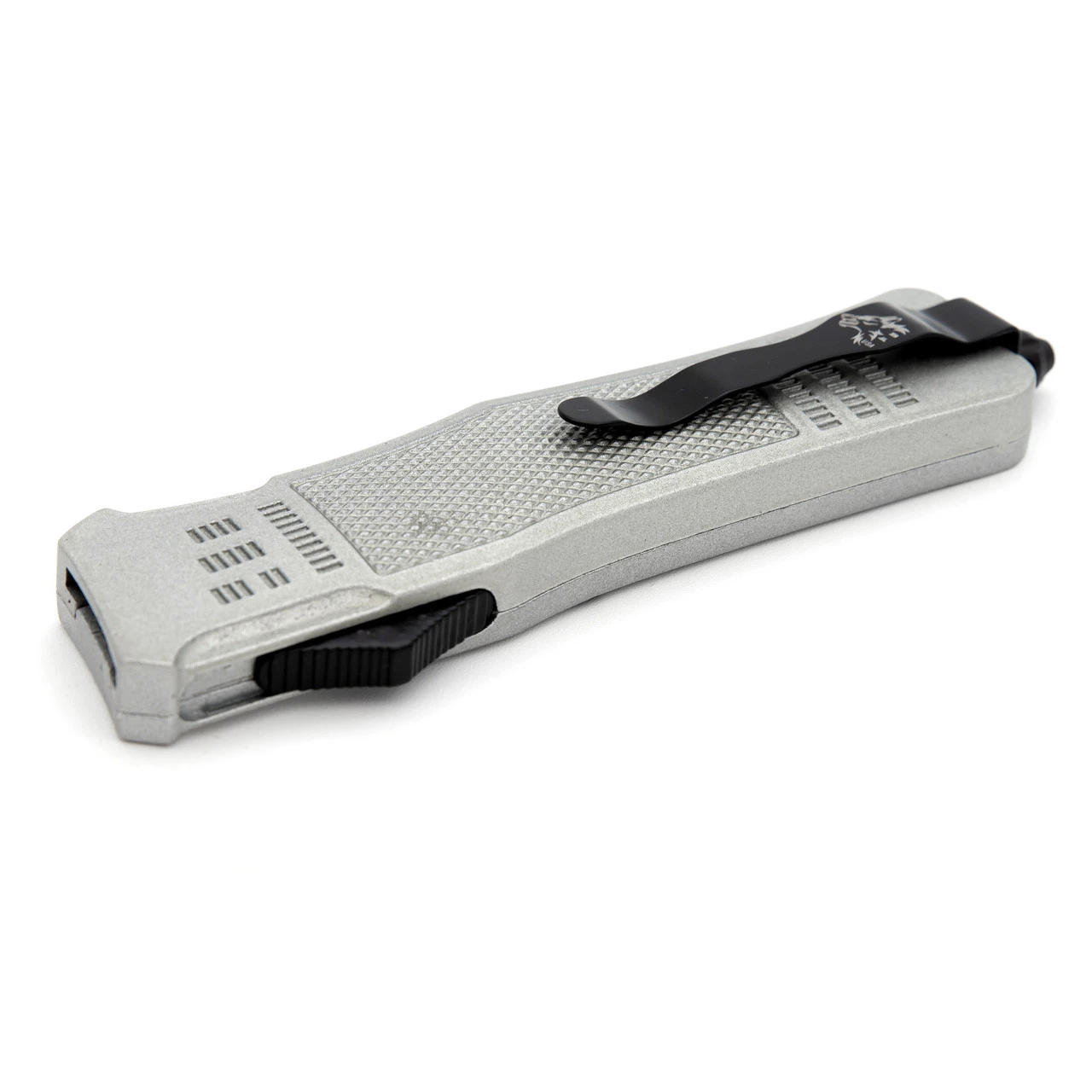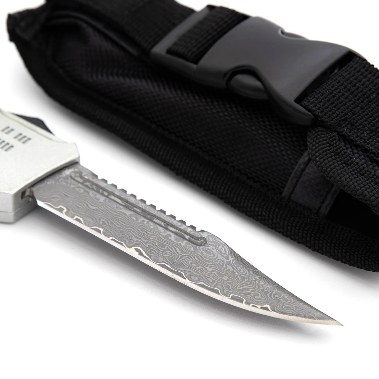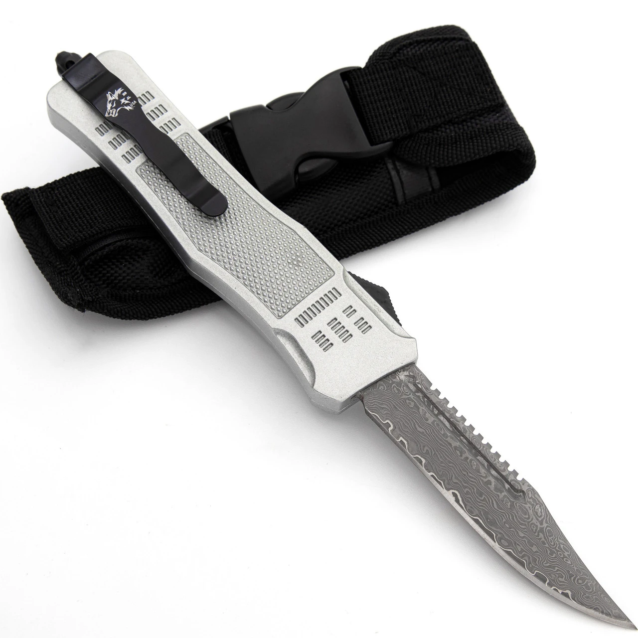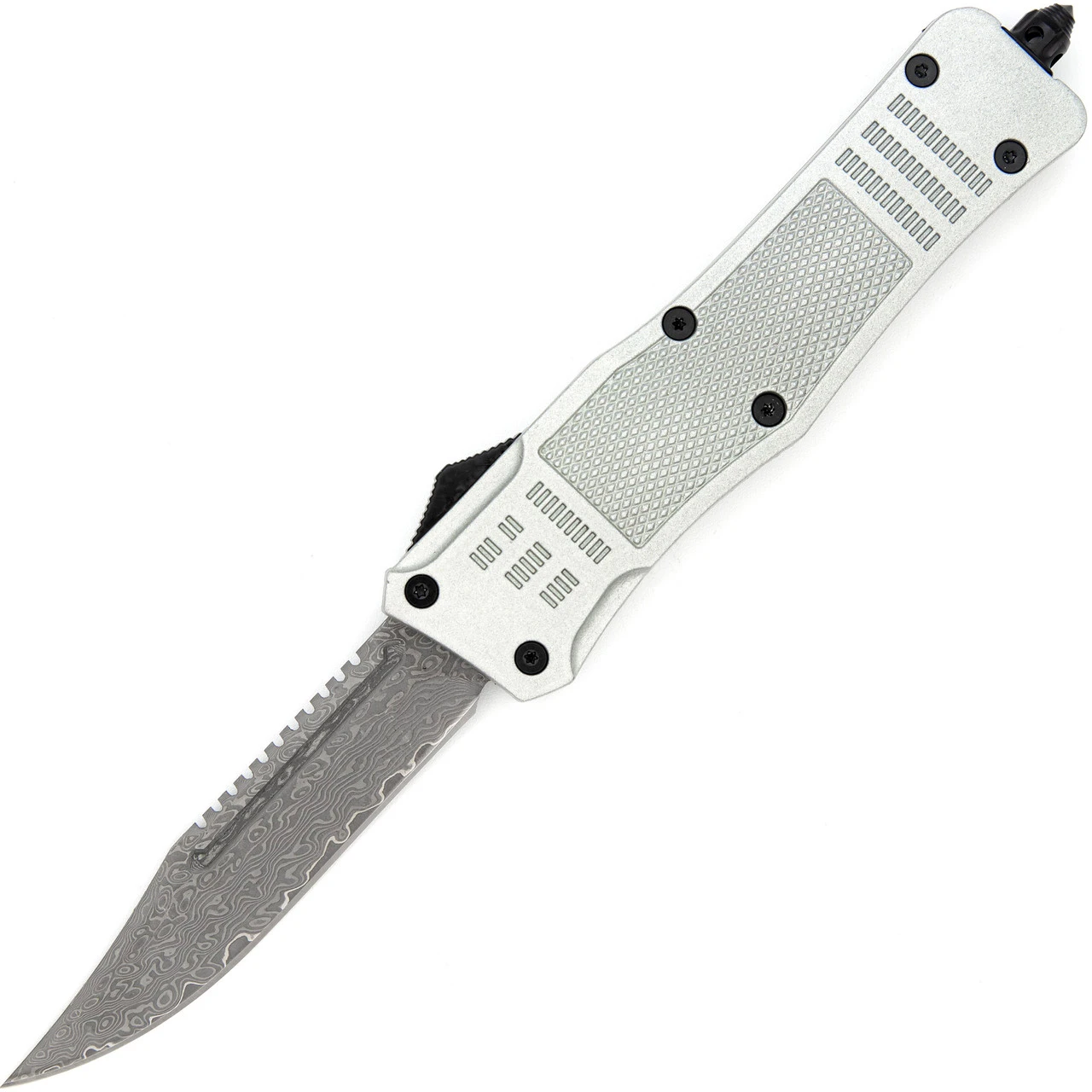 There are very few things that can paralyze the senses in under 5 seconds and the Screeching Metal Damascus OTF is one of them. The handle of the knife is a stunning silver aluminum with a diamond pattern dead center for grip. Unique and beautiful Damascus steel composes the blade like a fervent melody. For contrast, the switch, hardware, and belt clip are midnight black. Simply push the switch up and the blade springs into action. Slide the switch back down and the blade retreats into the handle for safe storage and carry. The Screeching Metal OTF comes with a black nylon sheath equipped with a belt loop for convenience and safety. Overall Length (Open): 9.5 Inches. Weight: 0.59 lbs.