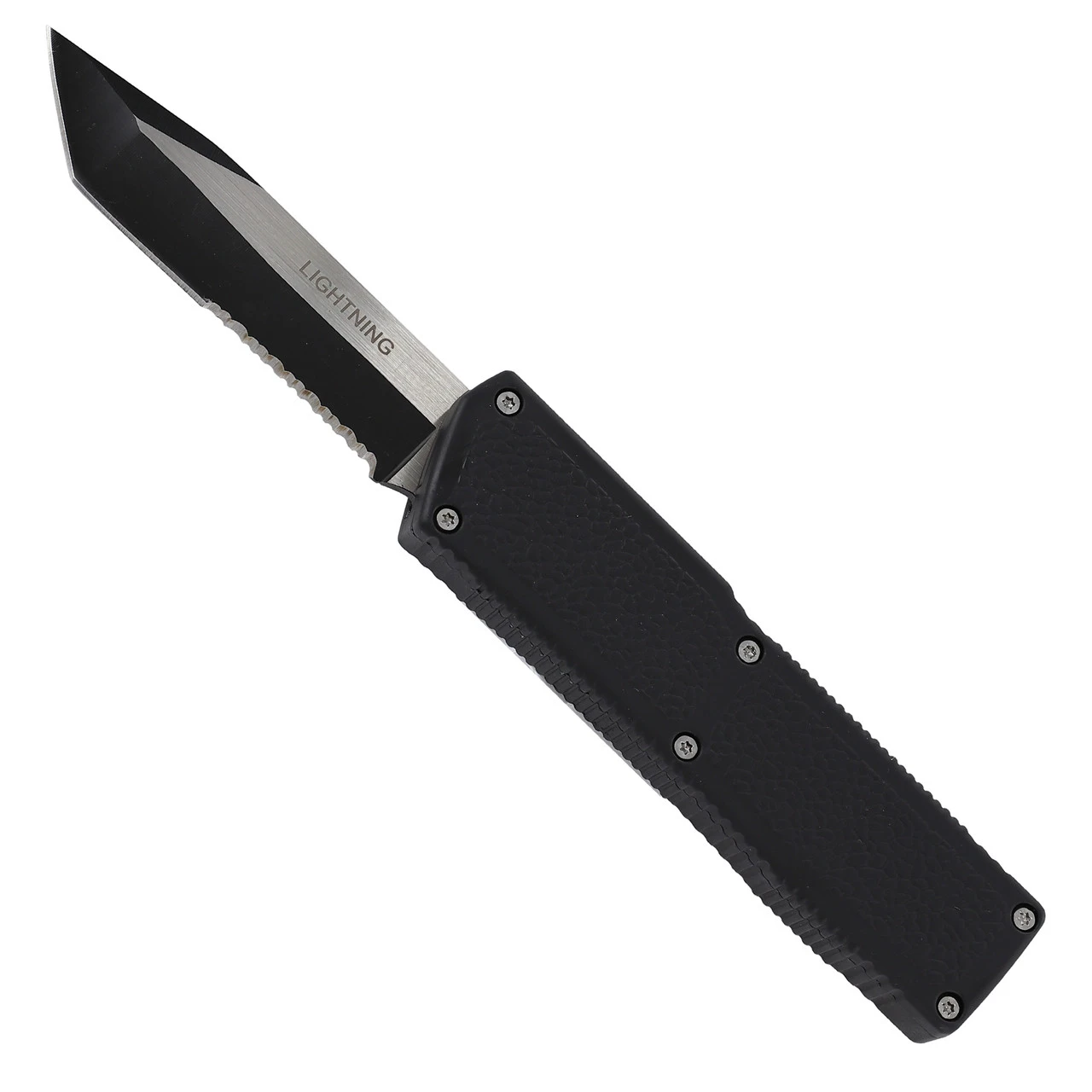 We bring the power of a Lightning knife at an affordable cost to you! Lightning knives are well known for their incredible sharpness as well as their rapid-fire capabilities. This means that a monstrous weapon can be at your beckon call in the mere push of a button located on the side of the handle. The tanto style blade of this powerful OTF is made from stainless steel and comes in a menacing two-toned finish and has LIGHTNING etched onto it so you know it means business. The partial serration of the blade belly makes it easy to perform tasks such as cutting rope. The heavy-duty zinc alloy handle is coated is a textured matte black finish for an excellent grip. A pocket clip is featured on the handle for easy transport. A black quick release sheath with belt loop comes included with purchase.