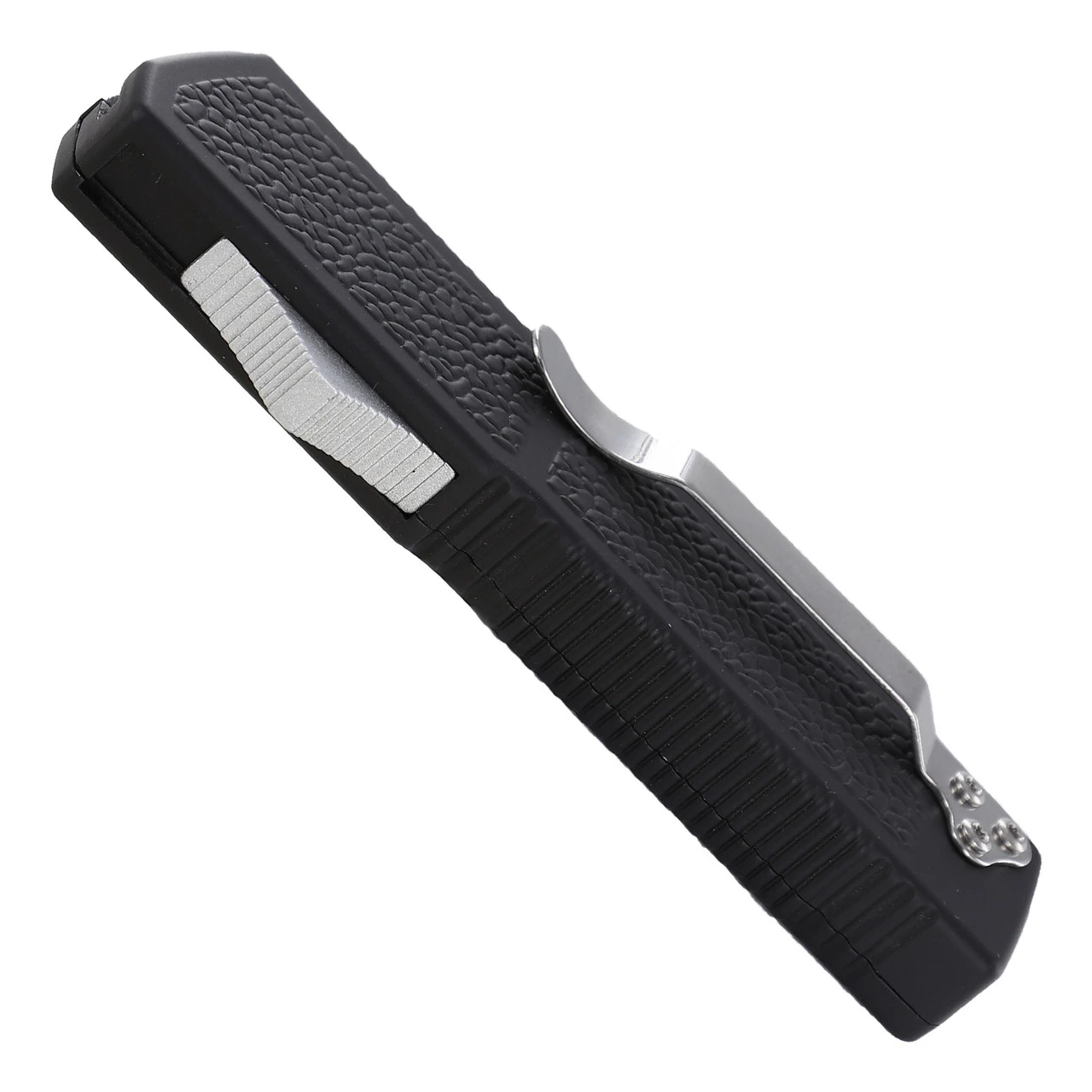 Features:Heavy DutyAutomaticDual ActionOut the FrontBlade Material: Stainless SteelTanto StyleTwo-Toned FinishPartial SerrationHandle Material: Zinc Alloy; Matte BlackTextured GripSilver Pocket/Belt ClipFiring Button SpecificationsOverall Length: 7.85 InchesBlade Length: 3.25 InchesHandle Length: 4.55 Inches