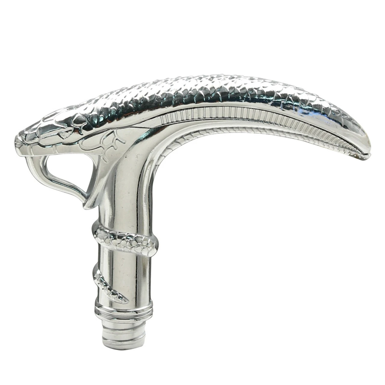 The Snake Head Walking Sword Cane is not your average boring cane. This cane is actually quite striking with its aluminum handle with a chrome metal finish. The snakes mouth is formed to give you the most comfortable grip. The snake wraps his body around the entire handle. The cap accentuates the handle nicely as if one piece. The sword cane features a 12.25 inch dagger style non sharp blade that slides into a matte black stainless steel shaft. The rubberized tip is great for balancing when walking for a stroll in the park. This cane is a great example of craftsman ship and durability. Overall Length: 36.25 inch