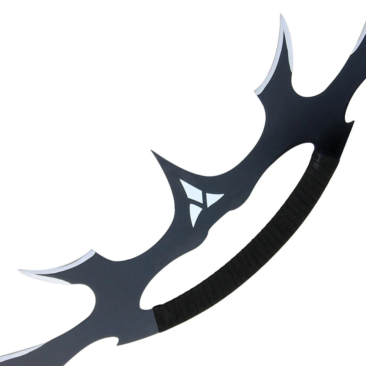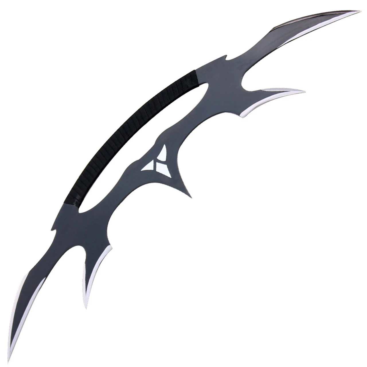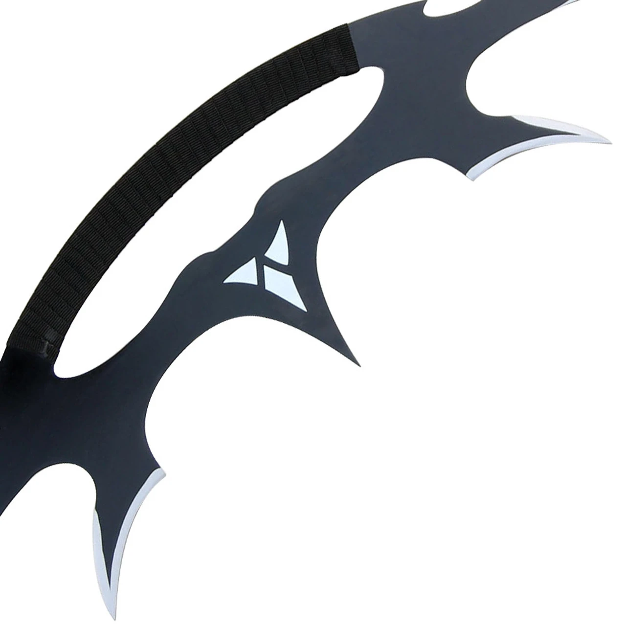 This unique sword is made from carbon steel with a black finish. The handle is wrapped in a nylon ribbon for comfort. Blades come sharp. In the center the Klingon Empire sits as bold as this blade.Overall Length: 32.13 Inches.