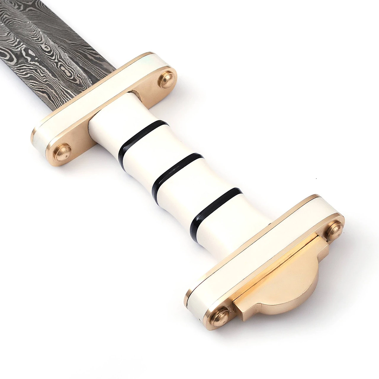 The blade of this sword is forged from a blend of 1095/15N20 steel that has been tempered and treated to create this gorgeous pattern welded Damascus steel you see here. These steels have been folded approximately 400-520 times, and the end result has a Rockwell hardness rating between 58-60. Damascus steel is not only quite beautiful to look at, but also its durability along with flexibility is what makes it so valuable among collectors. Not only is the Damascus a unique feature on this sword; the hilt features a rectangular design that is based off of findings dated as far back as 850AD. The white color of the hilt is complemented nicely by pure brass accents. Included is a 100% genuine leather tooled back sheath that is red-brown in color with a zigzag design that features black borders. Needless to say, this sword is fit for a king. Overall Length: 33 inches, Blade Length: 25.25 inches