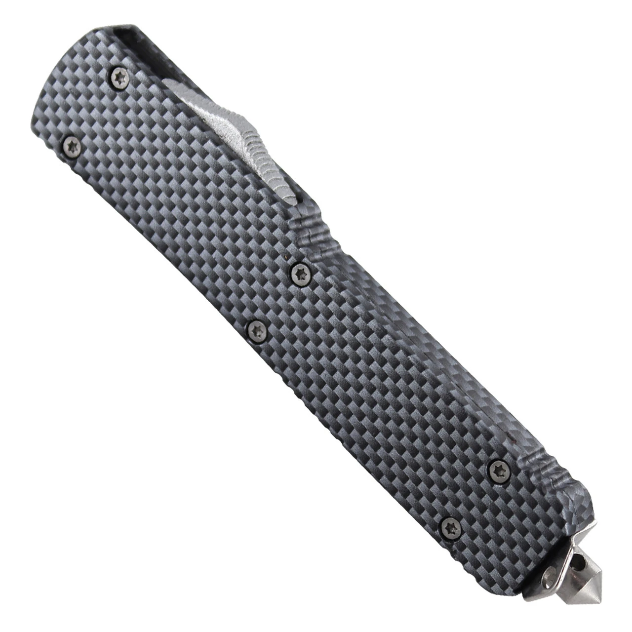 If a durable automatic OTF knife that won’t break your budget is what you are looking for, then look no further. This knife may not look like much just looking at the lightweight zinc alloy handle with a carbon fiber design, but when you use your finger to slide the button located on the spine of the handle upwards, the blade pops out of the front of the handle and it become obvious that you aren’t messing around. The stainless-steel blade features a drop point style, but gives the appearance of a spear point to catch your opponent off guard. the partial serration on the blade and the glass breaker on the end of the handle turn this OTF knife into a tactical weapon. If you’re in a dangerous situation that requires you to cut off your seatbelt and break the window of your car, you’re all covered with just one knife. The steel pocket clip on the handle lets you carry your knife with ease, but if you prefer to keep it out of sight, we have provided a free nylon carrying case as well. Overall Length: 8.38 Inches, Blade Length: 3.38 inches