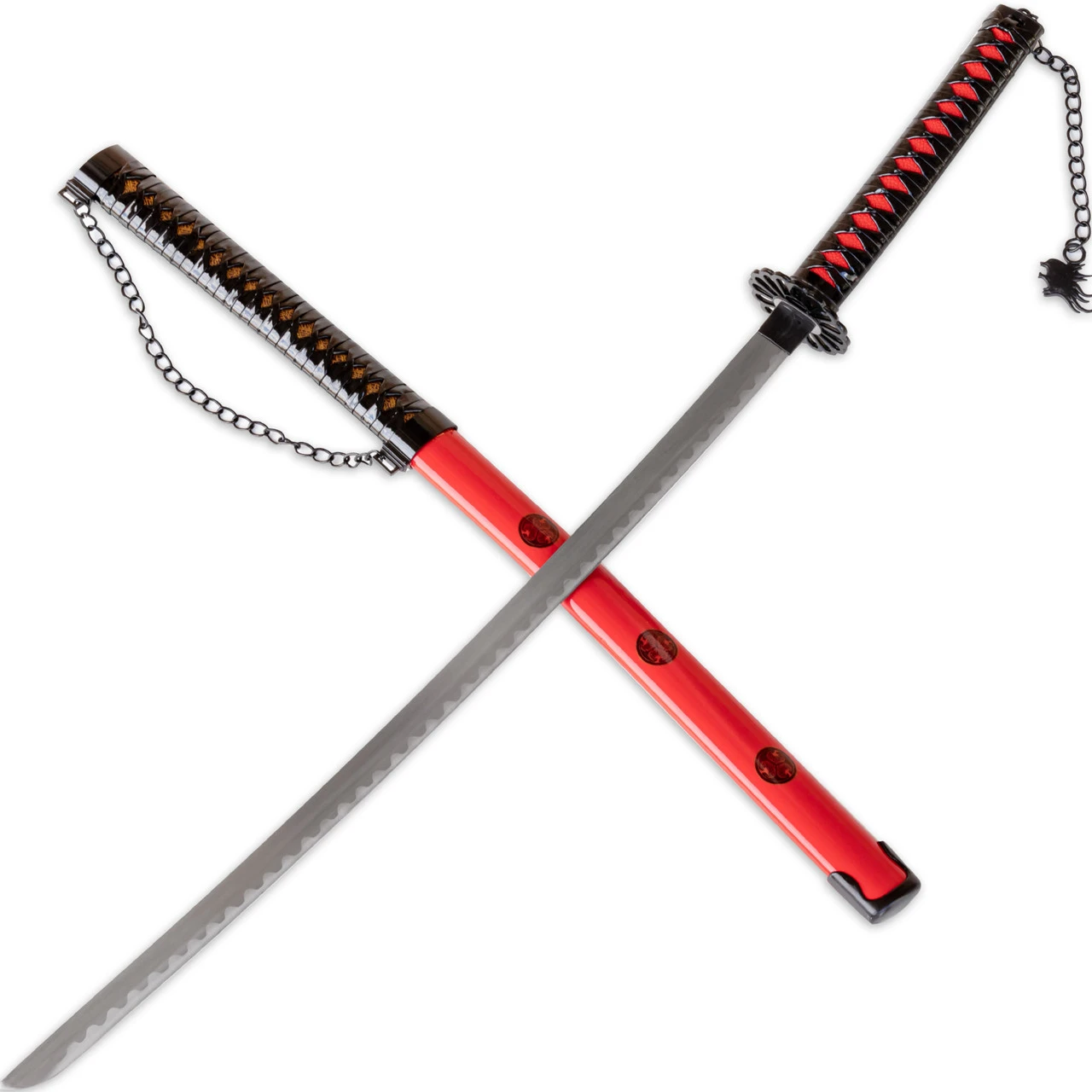 Wrapped in chains to stay with me; decorated and intricate, red and black with gold filament peeking through. The Tethered Existence Decorative Katana is glorious. The handle is textured red ABS over wood with black vinyl twisting over it in the classic katana braids. These braids extend into the scabbard with a patterned gold brocade glinting underneath. The guard is in a looping, almost floral, shape. The red part of the scabbard is aluminum with the Tokugawa family crest stamped along it. A length of black chain is affixed to the scabbard and another one hangs freely from the pommel of the sword with a charm on it. The blade is stainless steel with the classic katana wave along its length. The blade is dull so the Tethered Existence can be used for cosplay, costumes, or display. Overall Length: 39 Inches. Weight: 2.3 lbs.