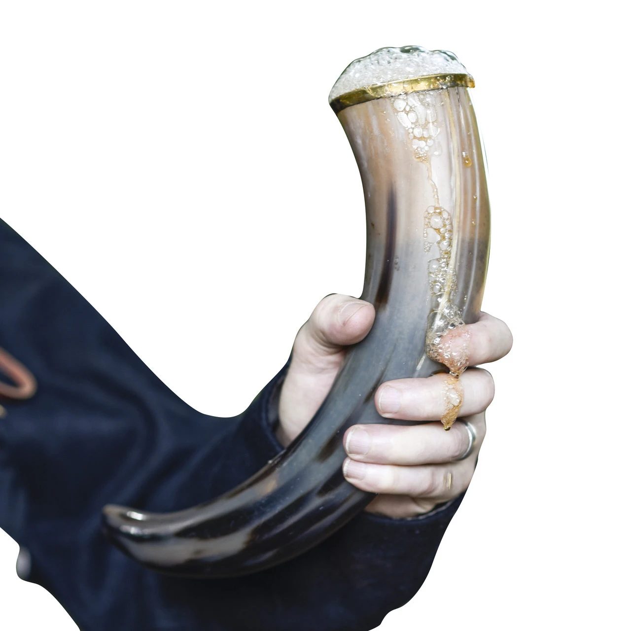 This drinking horn is carefully hand-made from a single piece of horn which has been patiently cut to the right size and then fully cleaned, polished and sealed inside with a food-safe sealant so it is safe to drink from. This 12″-15″ Viking horn comes with a FREE complementary “The Hooded Raven ™” canvas bad to protect it! Great gift choice for any Norse Culture fan! With this horn in your hands filled to the brim with your liquid courage, you can conquer the day just like a true Viking! Hand-made from a single piece of real buffalo horn from India and adorned with a rim made from 100% pure brass. Ethically harvested: no living animal has been hurt in the process.