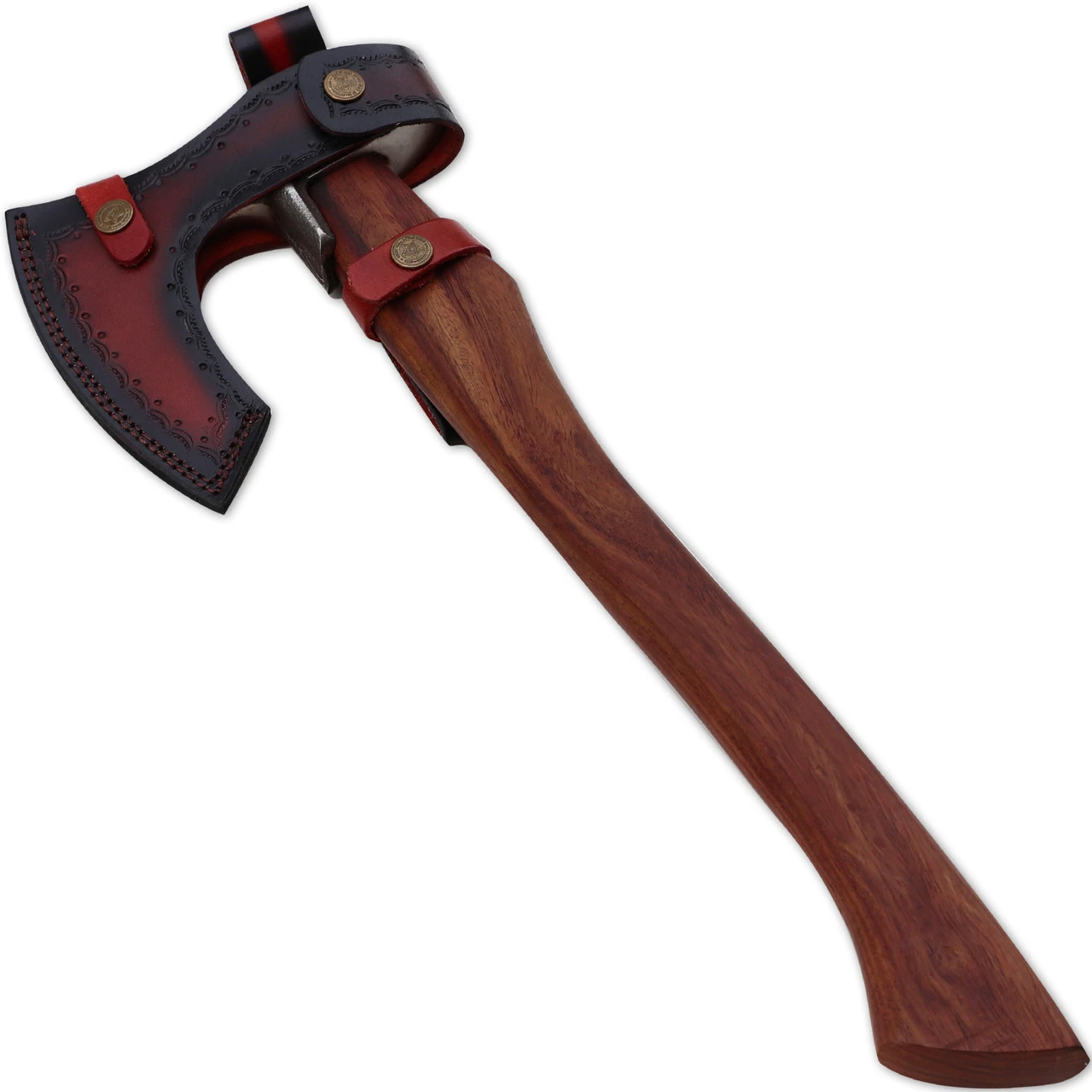 Possess the power of the mighty Thor with this beautiful axe made from high quality steel. The blade of this bearded axe is etched with intricate Viking-inspired motifs and comes with a standard sharp edge. Not only is it great for chopping, if you turn the axe around the flattened backside of the head also doubles as a hammer! This can be useful for tasks such as hammering in steaks or other objects securely into the ground. This is the perfect multipurpose tool to bring along with you on your next camping trip. When not in use, we recommend storing the axe in the tooled genuine leather sheath included for protection. Overall Length: 18 inches, Blade Length: 4.5 inches