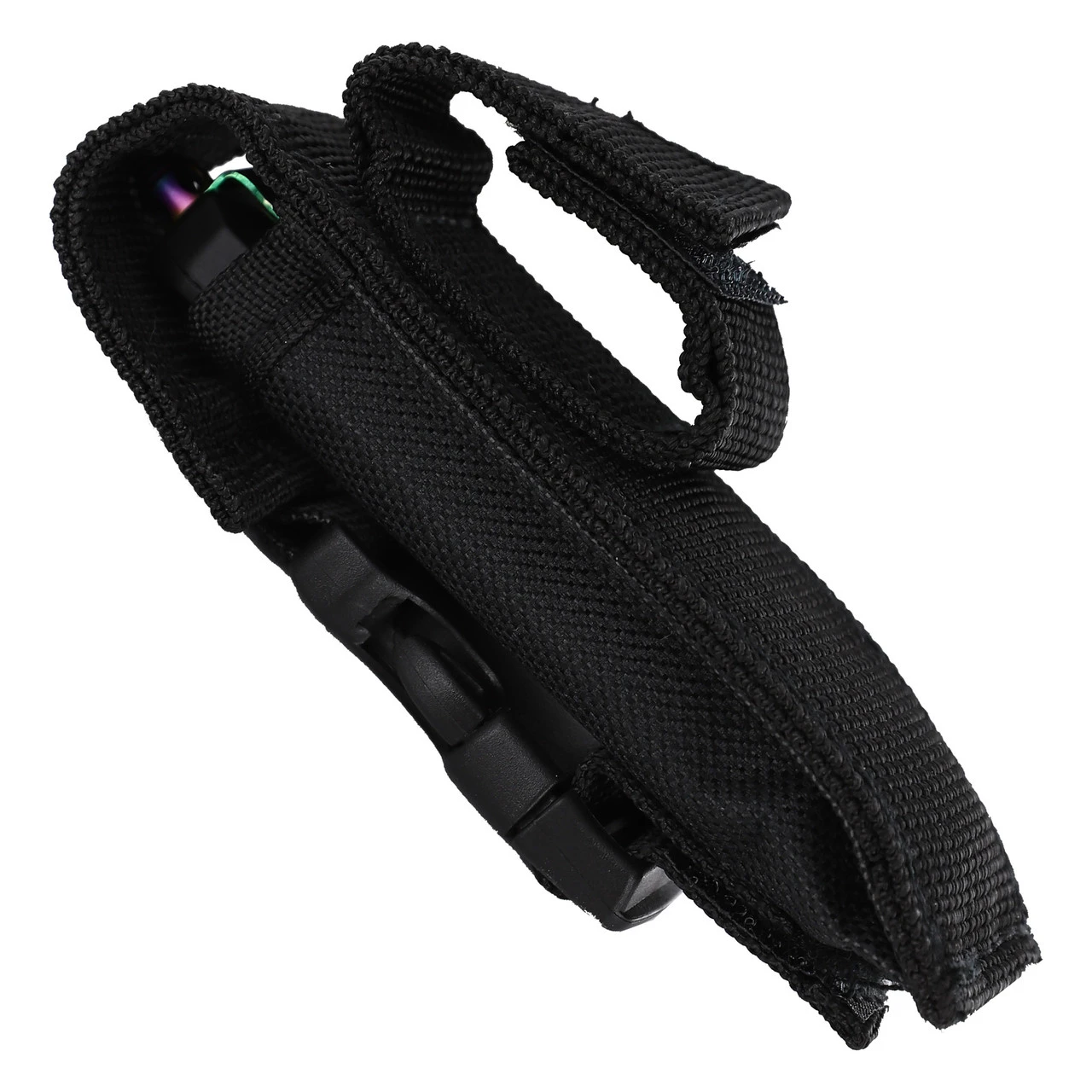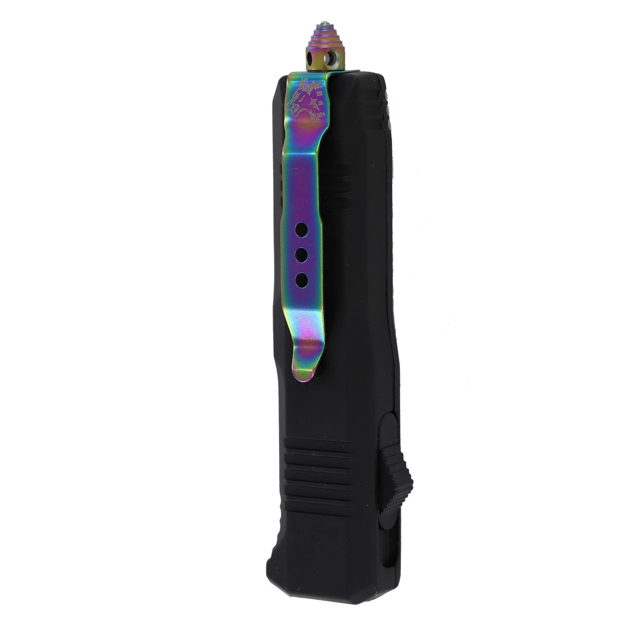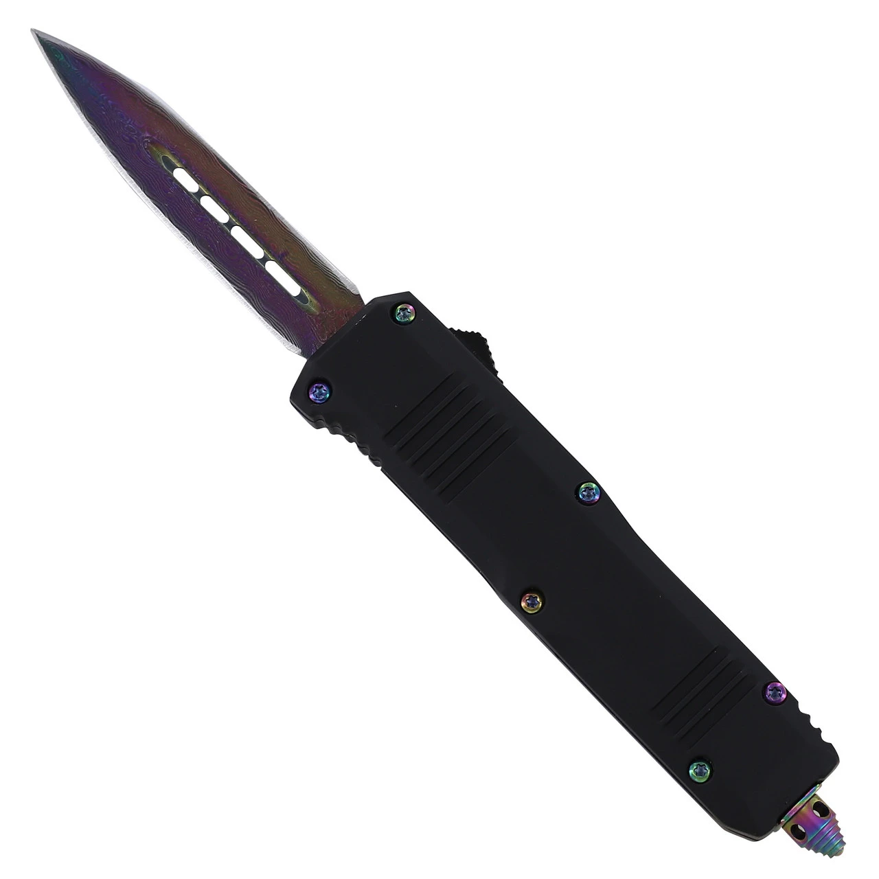 This knife has all of the power of a regular Out the Front knife, now in a miniature size! The blade is forged out of 1095/15N20 Damascus steel that has been folded over and over approximately 176-180 times to give it that beautiful and unique wave-like pattern. This steel has a Rockwell rating of 54-56. The blade is formed into a spear point style and has been heat treated to present a gorgeous titanium rainbow finish. The matte black handle casing is made from a durable zinc aluminum alloy. the blade of this dual-action automatic knife can be ejected and retracted using the switch located on the side of the handle. The handle also comes equipped with a rainbow titanium pocket clip and glass breaker in case of emergencies. Included with your knife is a black sheath with snap closure and belt loop so you can conveniently carry it anywhere. Overall Length: 7, Blade Length: 2.75 inches