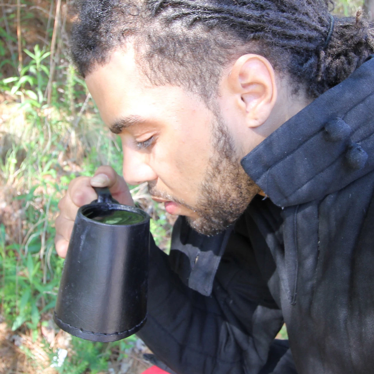 Designed with a broad base for shipboard stability, the Tudor style tankard has become the traditional tankard shape and style. Holding approximately 1 pint of beverage, this tankard is expertly handcrafted from thick, high quality heavy saddle leather which serves to keep the vessel strong and sturdy. Lined with waterproof brewers pitch, the tankard is perfectly suitable for either hot or cold drinks. Height: 4 Inches Upper Circumference: 8.6 Inches Bottom Circumference: 11 Inches.