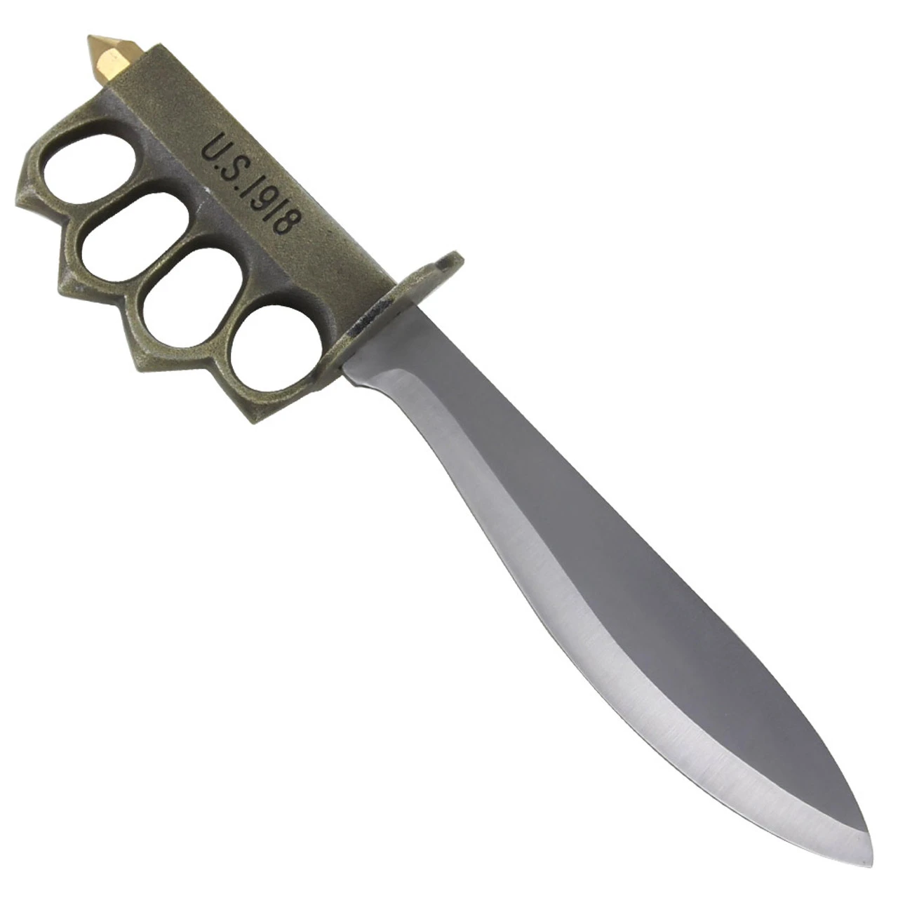 This knife comes equipped with a bolo style blade made of stainless steel with a satin finish. The handle is a cast metal design with U.S. 1918 on one side. A short guard protects the users hands while they use the fully functional knuckleduster to bust their enemy in the face and if that isnt enough, the striking pommel will finish the job or you can use it as a glass breaker if need be. It also comes with a nylon sheath with a belt loop. Overall Length: 13 Inches.