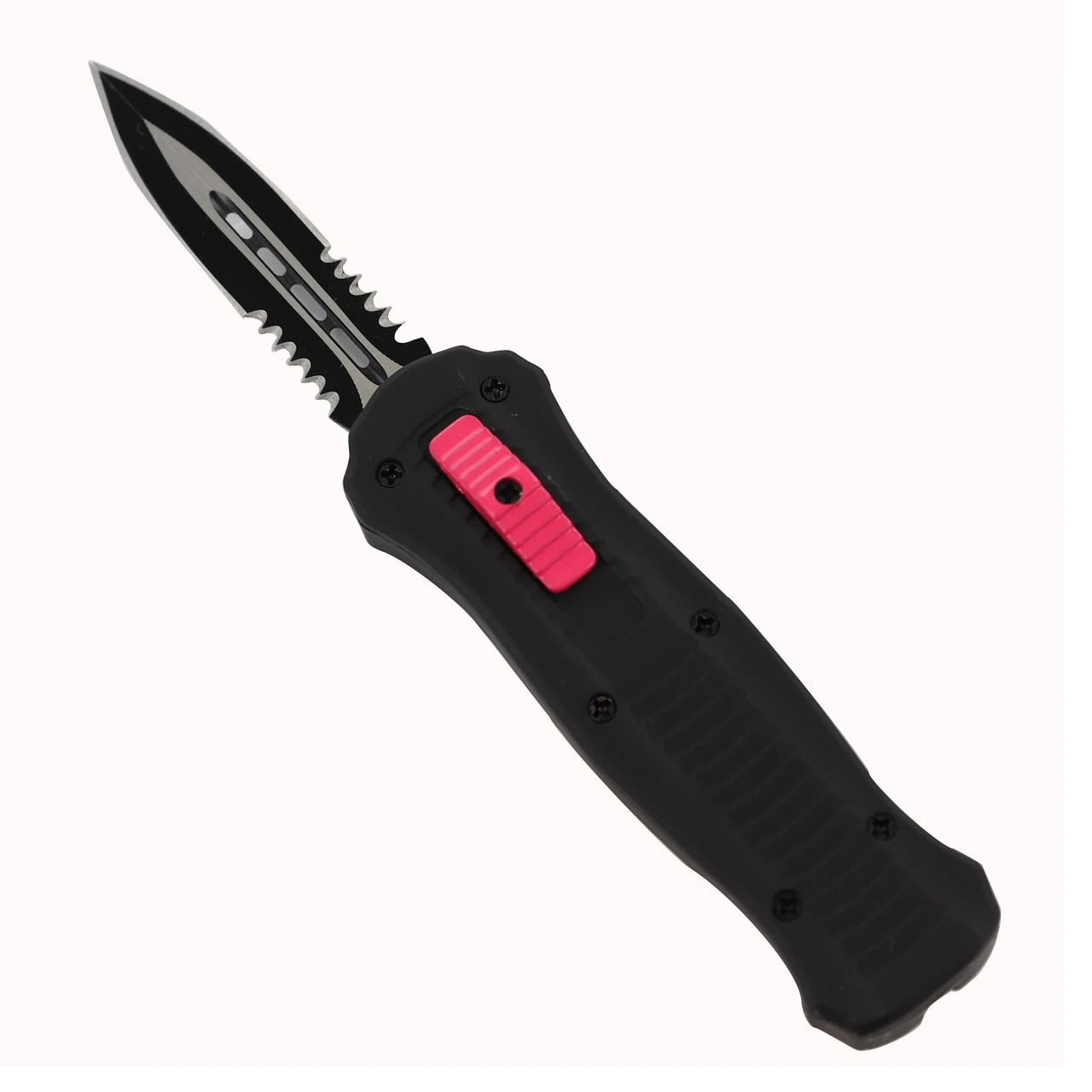 This mini version of a tried and true automatic out the front knife may not seem like much at first glance, but believe me when I say that this is the perfect little accessory to add to your purse. The stylish matte black zinc alloy handle has the same feel as a nice tube of lipstick, if you know what I mean ladies. Not only is it cute, but it is perfect for many types of emergency situations as well. It has a dual action mechanism, so you can open and close the blade with Barbie pink switch on the middle of the handle in one swift motion. The blade itself is made of stainless steel in a two-tone finish. The blade is formed in a spear point style, making it excellent for stabbing, and is also partially serrated on both sides of the blade, which not only looks menacing but can also come in handy in case you need to saw through rope or cord. A pink pocket clip on the back of the handle allows you to clip this knife to your pocket or purse for easy access. To top it all off, this beauty also comes with a nylon carrying pouch, in case a purse isn’t your style. Overall Length: 5.5 inches, Blade Length: 2.125 inches