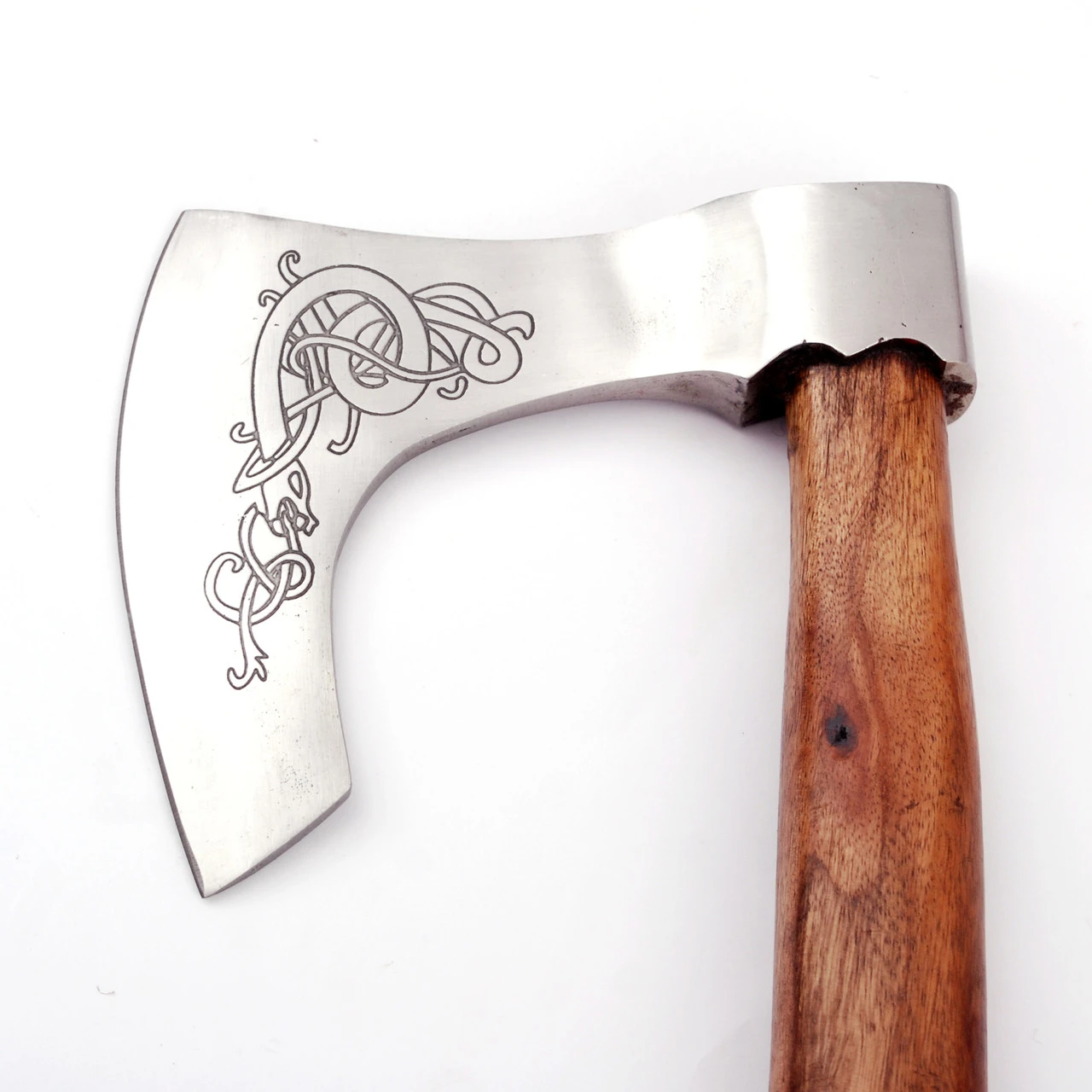 Men were not the only ones wreaking havoc on the battle field, you know. In fact, female Viking warriors were mentioned in several sagas throughout Norse history. These brave women-at-arms were referred to as shield maidens. This axe is made for women who aren’t afraid to get down and dirty like the true Viking warrior they are. Forged from carbon steel, the head of this axe is razor sharp and ready for war, with a serpent etched on either side to remind the wielder to strike quick and show no mercy. The bearded style of the axe head is perfect for hooking an opponent’s shield to bring down their defenses or to catch an attacker’s leg to throw them off balance. The handle is made from durable sheesham wood and stained a brilliant oak color. A lanyard hole located at the bottom of the handle allows you to attach a cord or string. Available with or without floral motif on handle. *Please note that Handle with floral engraving is slightly darker than handle without engraving.