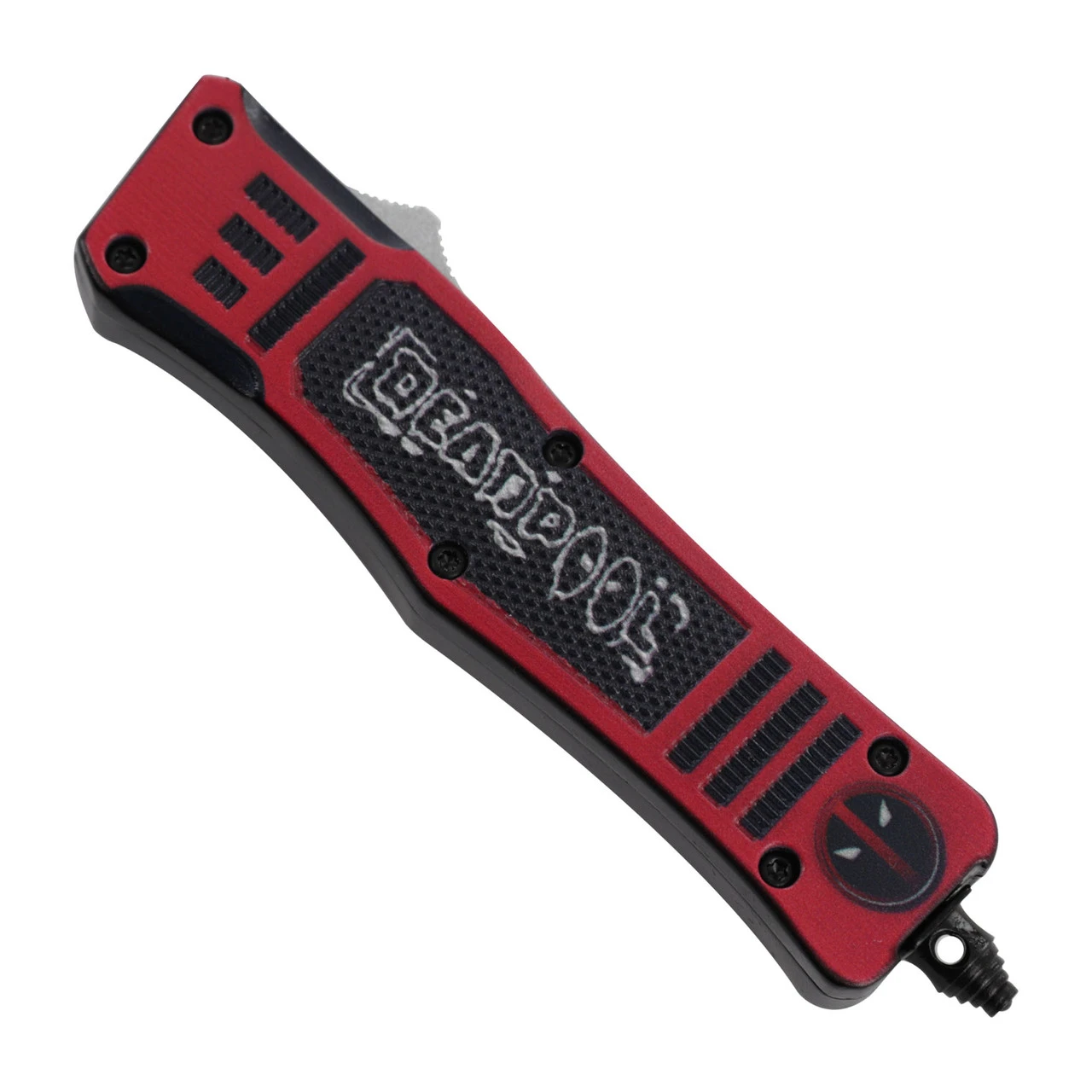 In order to be the Merc with a Mouth, one must have the proper weaponry. This compact out the front knife is the perfect start to your collection! This automatic knife comes with a 2.75-inch stainless steel blade that features a spear point style and two-toned black and silver finish. The handle is made from durable zinc alloy with a black and red finish, and features symbols from everyone’s favorite regenerating degenerate. This handle comes with a steel black pocket clip for easy carry and a glass breaker on the end to come in handy in case of emergency situations. Included with your purchase is a FREE black nylon carrying case that features a quick release and belt loop. Overall Length: 7 inches, Blade Length: 2.75 inches