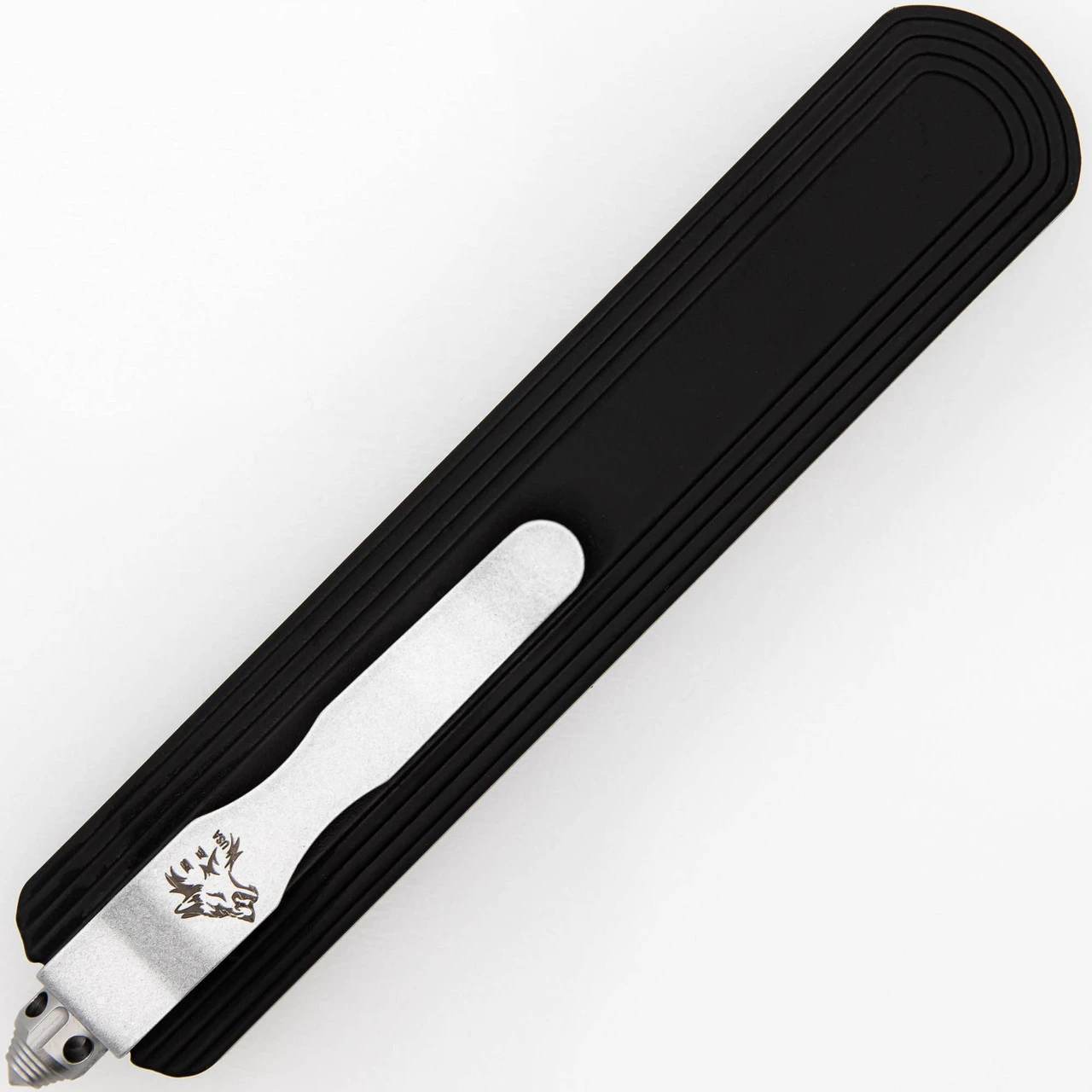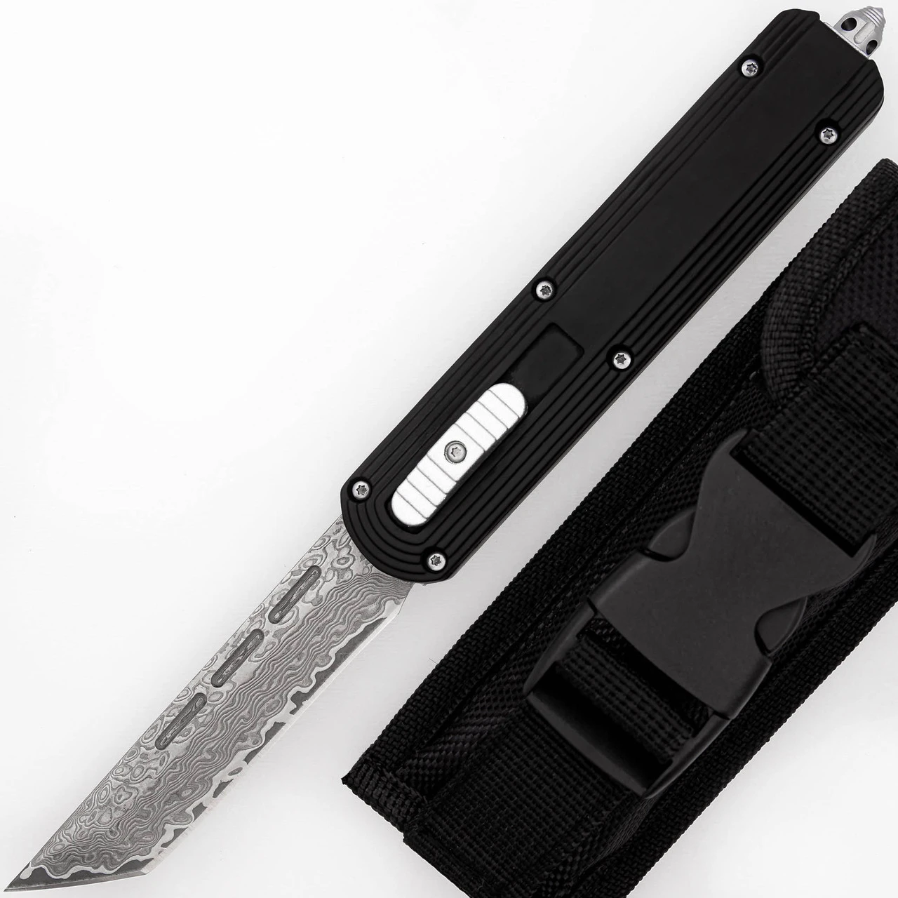 This impeccable knife has swift action along with style. Constructed of durable Damascus steel, the tanto style blade is made mainly for puncturing and piercing. The dual action allows you to use a slider trigger located on the front of the handle to propel the blade forward as well as retract. The handle is made from zinc alloy with a molded four-line design around the edge. The matte black finish reduces glare and is a popular color for automatic knives. Sporting shiny silver hardware, including a steel pocket clip and emergency glass breaker, this knife is not only functional but nice to look at. Included is a black nylon sheath for easy carry. This durable blade will last for years to come. Overall Length: 9.5 Inches, Blade Length: 3.75 Inches