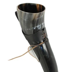 All natural buffalo horn is hand carved to create this authentic drinking horn. Each horn is individually crafted, between 20 inches and 23 inches long. No two are the same. They can hold about 30-40 ounces of water, wine, beer, ale, etc. The exterior is polished to a smooth shine. Coloring of the horn varies according to how it was grown in nature. Mostly it is black and calcium white. A thick leather frog is included and allows it to fix to a belt.