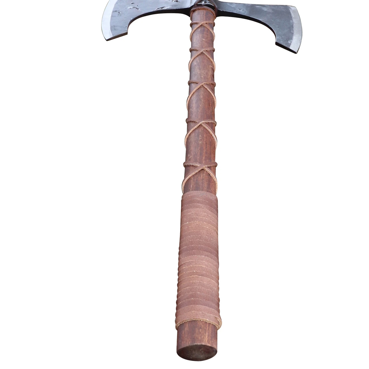 Our Iroquois Forged Carbon Steel Throwing Hatchet just got a big sister- and she isn’t messing around. This handcrafted Iroquois-inspired battle axe measures a full 31 inches. The shaft is made from sheesham heart wood that has been stained with an oak finish, enhancing the beautiful wood grain. The double bit blade is hand forged from carbon steel. A brown leather wrap gives a grip on the handle and crisscrosses up onto the blade. A sheath is also included with the axe. The overall effect gives this piece a Native American feel. Hang this exquisite axe on the wall as a lovely collection piece. Overall Length: 31 inches, Blade Length: 6.75 inches